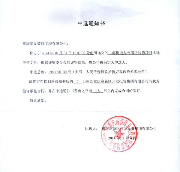 經過公開招標及評審委員會的評審結果,我司被確定為中標候選人。于2014年11月10日,我司與重慶高新區開發投資集團有限公司成功簽訂二郎街道辦公室裝修工程。