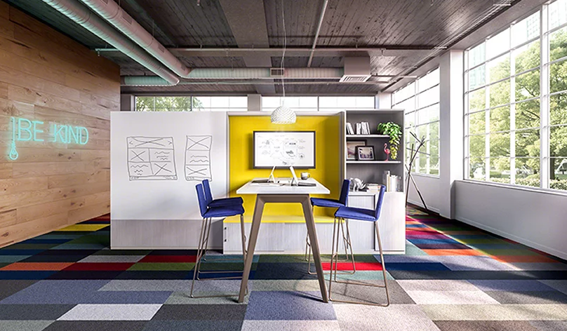 辦公室裝修的共享IT站包括靈活的存儲系統(tǒng)、照明和高度可調(diào)的辦公桌,用戶可以根據(jù)自己的需要定制工作場所。辦公室裝修的辦公桌與靈活的空間分隔屏結(jié)合在一起,這些分隔屏定義了個人邊界,允許工人展示他們的工作并將個人筆記釘在一起。