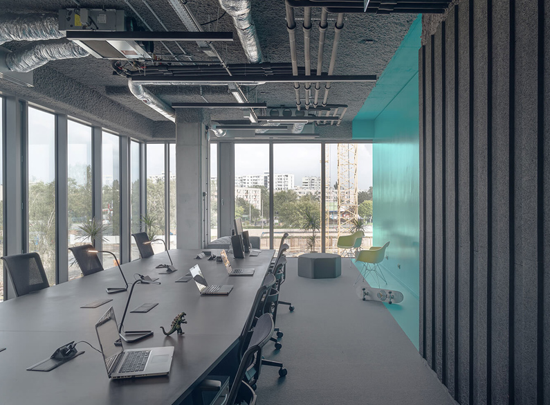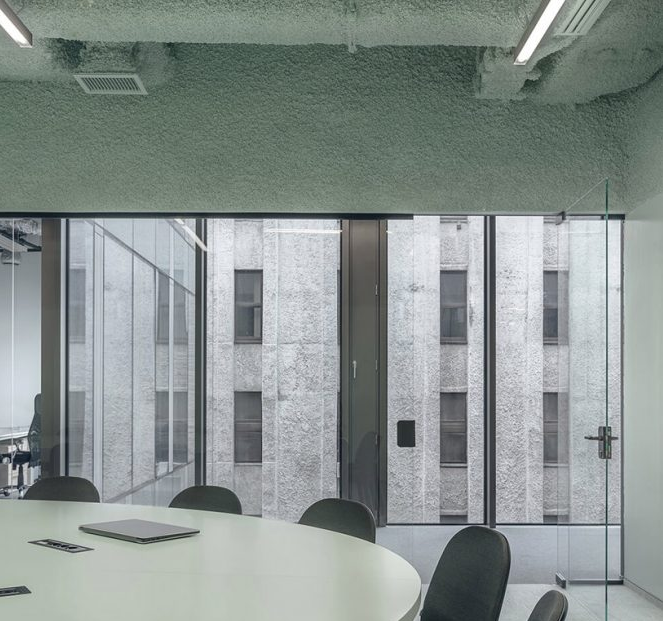 辦公室裝修采用的噴霧泡沫天花板和聲學面板墻被用來減輕聲音的傳輸和保持聲學的舒適性。而不是解決這與一般的聲學天花板瓷磚或擋板,聲學處理被整合為空間室內(nèi)設計的一部分。辦公室裝修的隔音墻板采用條紋浮雕圖案,為內(nèi)墻飾面提供尺度和節(jié)奏感,而辦公室裝修的天花板則采用整體方式,在某些情況下覆蓋所有機械設備,將它們變成懸掛的抽象物體,通常會被通用下降的天花板系統(tǒng)所掩蓋。