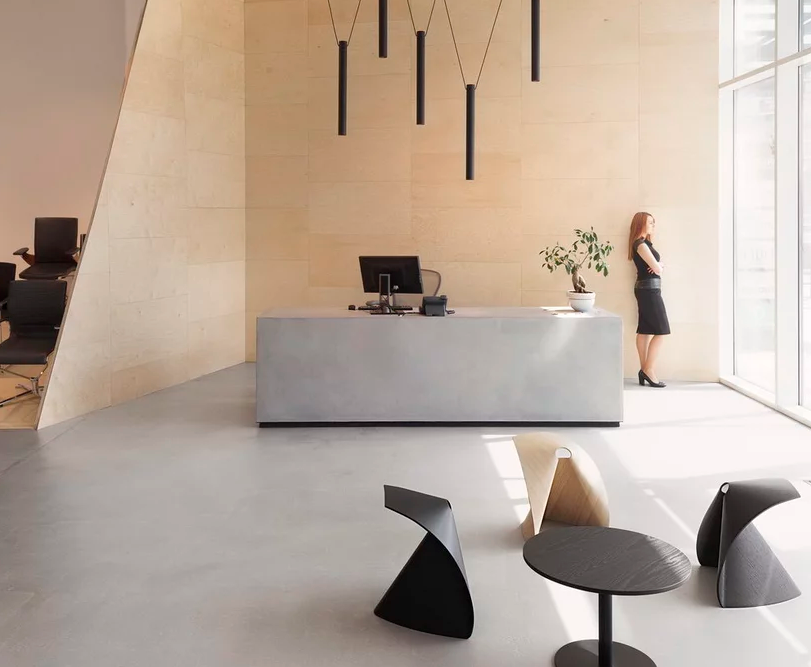 辦公室裝修傾斜的膠合板平臺允許椅子的高度安排,并通過這種方式暴露在每一個觀賞點。這個木制元素垂直向上,動態地圍繞著接待區,“引導”顧客從展廳的入口到經理區。在集裝箱和膠合板平臺外,整個辦公室裝修空間的設計盡量減少使用材料-混凝土地板、白色墻壁、天花板和設施。這一設計,結合航運集裝箱,辦公室裝修創造了一個簡單的工業外觀,強調復雜的模式和精確的細節所展示的家具。