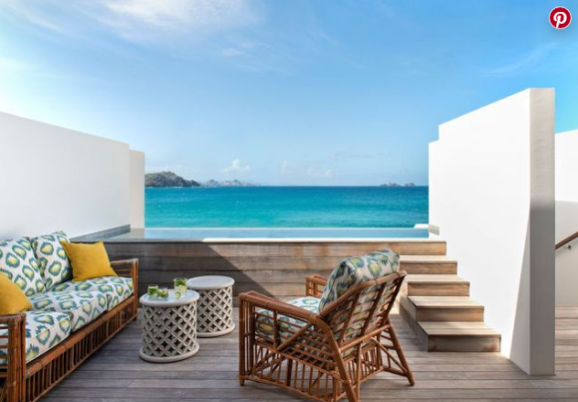 建筑師Kirscher設計的新海灘套房提供帶私人游泳池的田園風格露臺。沙發和藤椅(serena&Lily)覆蓋著ikat面料(IDO擴散)。靠墊(設計師協會)。